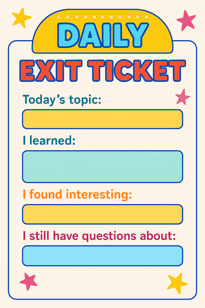 Our vibrant Daily Exit Ticket is the perfect formative assessment tool to help students reflect, review, and retain what theyβve learnedβwhile giving teachers quick insight into student understanding! Ideal for wrap-up routines, this printable boosts engagement and metacognition in minutes! π§ πβ¨